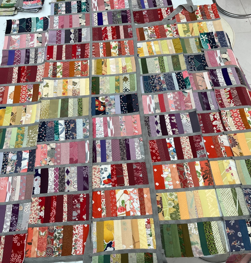 Continue reading →: The rainbow quilt is evolvingHaving made around 150 rainbow blocks I started sewing them together with grey stripes. And then my sewing machine seized up! Frustrated that my project had to go on hold, I started reimagining a previous project of strips of kimono fabric I had sewn together. I was going to join…