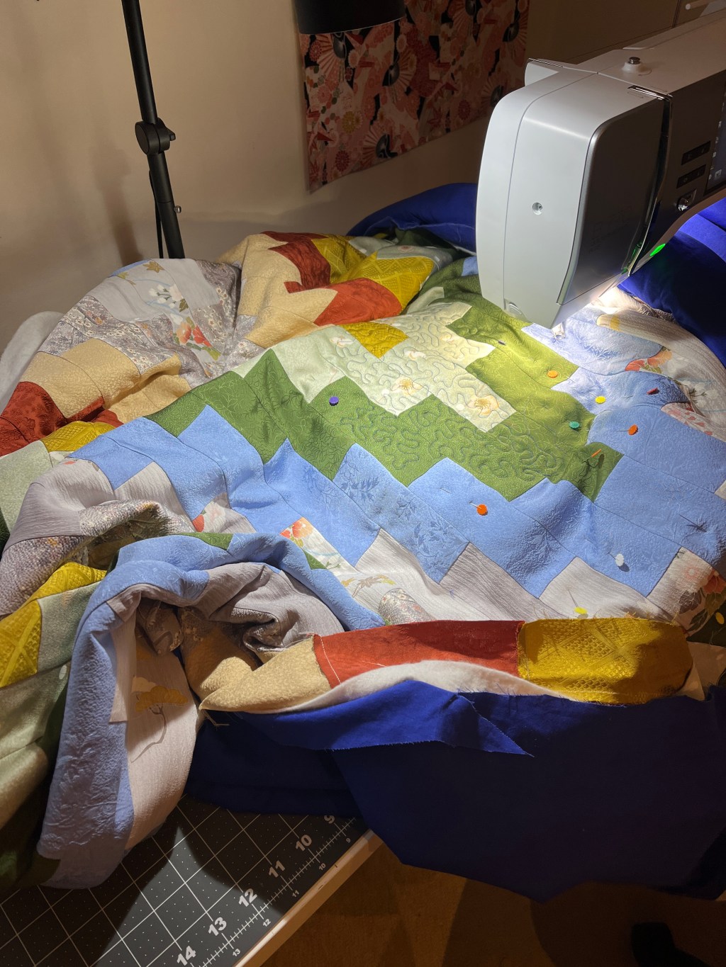 colour, design, FMQ, free motion quilting, kimono fabric, kimono quilt, quilt top, quilting, upcycling kimono