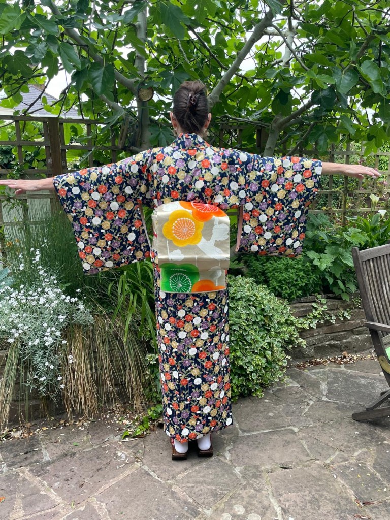 I give talks about the history and types of kimono, dressed in full kimono and obi and, I can tell you, wrapping 38’ of fabric around your body is a real effort! I learned to tie obi by wrapping it around my body twice, tying the knot at the front and then shifting the whole thing around my body until the knot is at the back. And I seldom get the knot straight, it seems to shift as I move it!