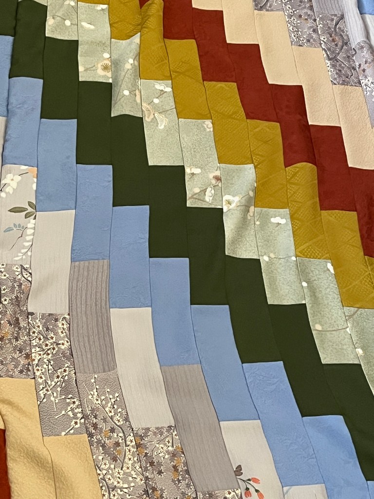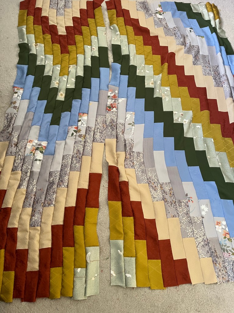 I have so much kimono fabric to choose from so decided to make an ‘all year round’ throw quilt, I chose seven kimono fabrics to present the seasons. But forgot pink.