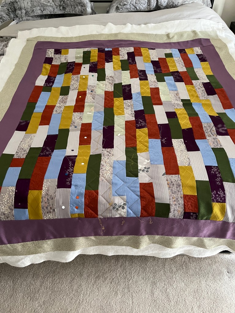 Just started quilting a throw made from silk kimonos. I was really pleased with the assortment of coloured fabrics but having looked at this photo it looks like I’ve put lots of coloured lego bricks together!