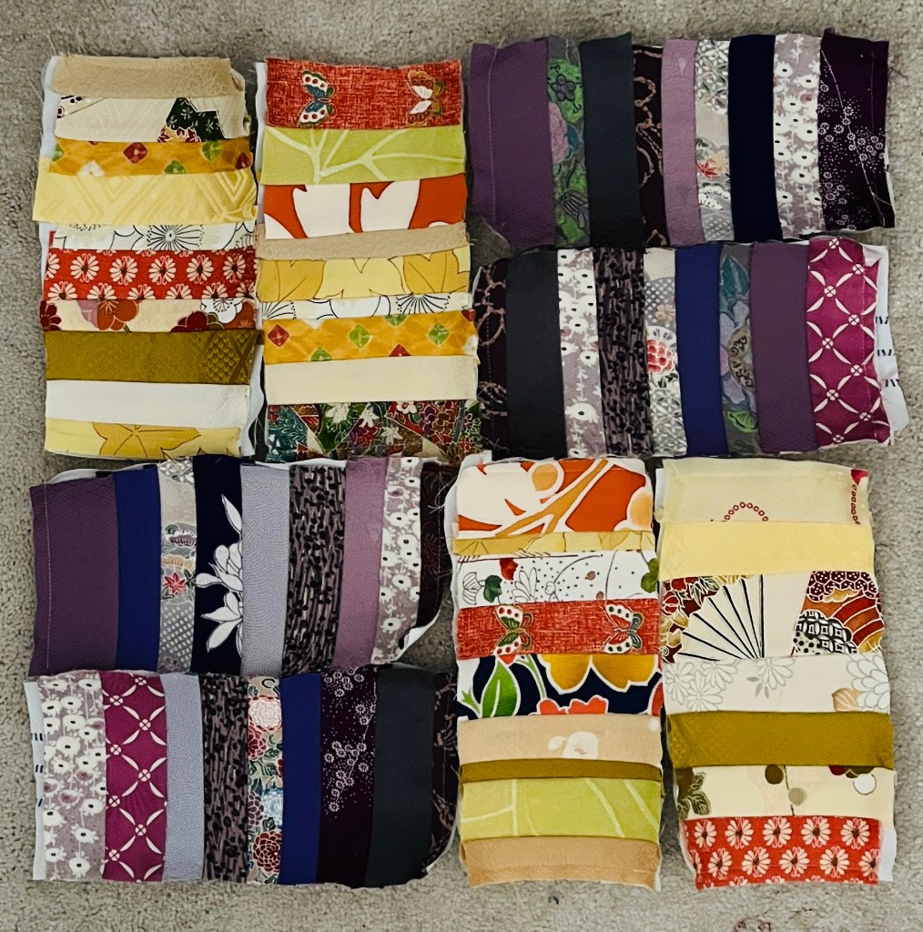 So I started playing with kimono fabric scraps, joining in QAYG strips. Not sure what colour to play with next!