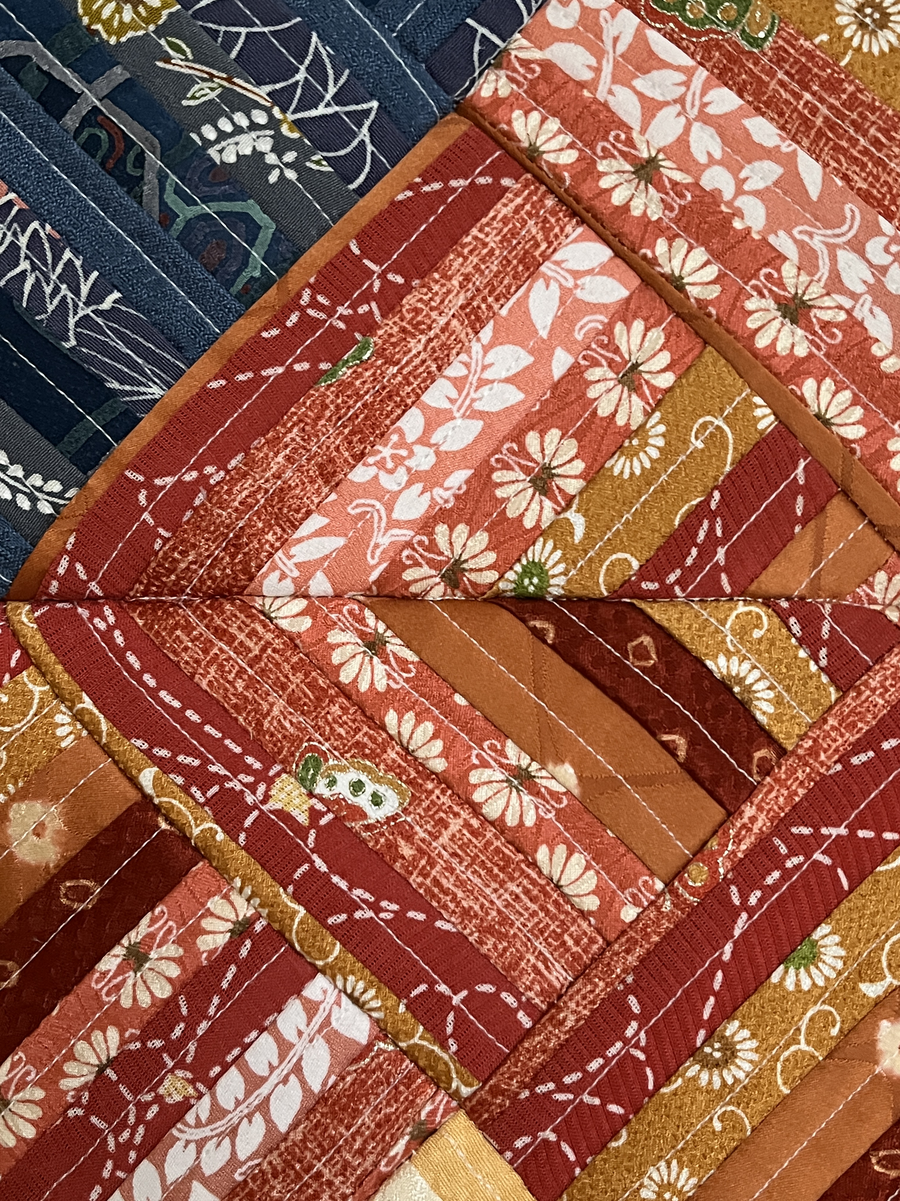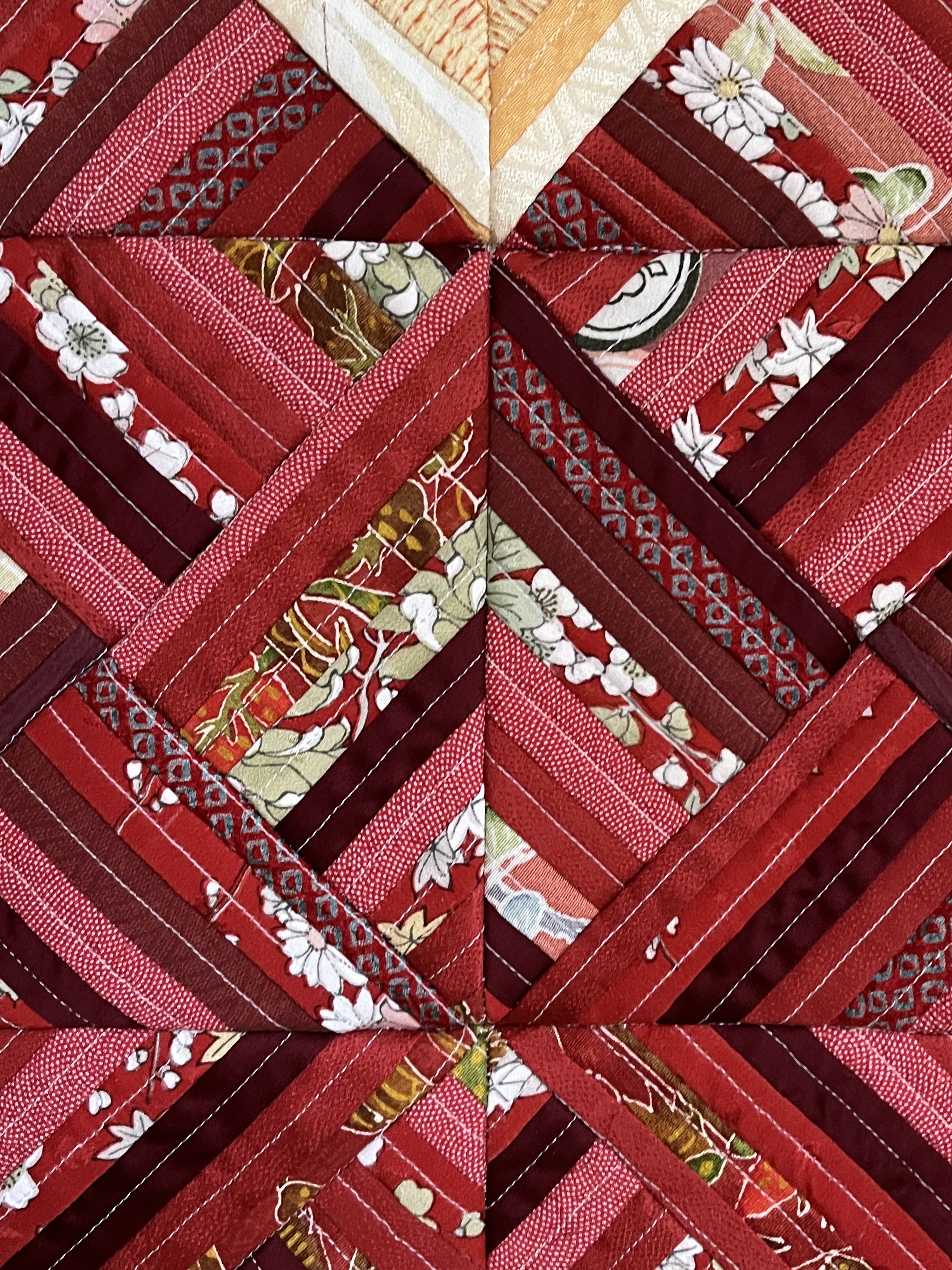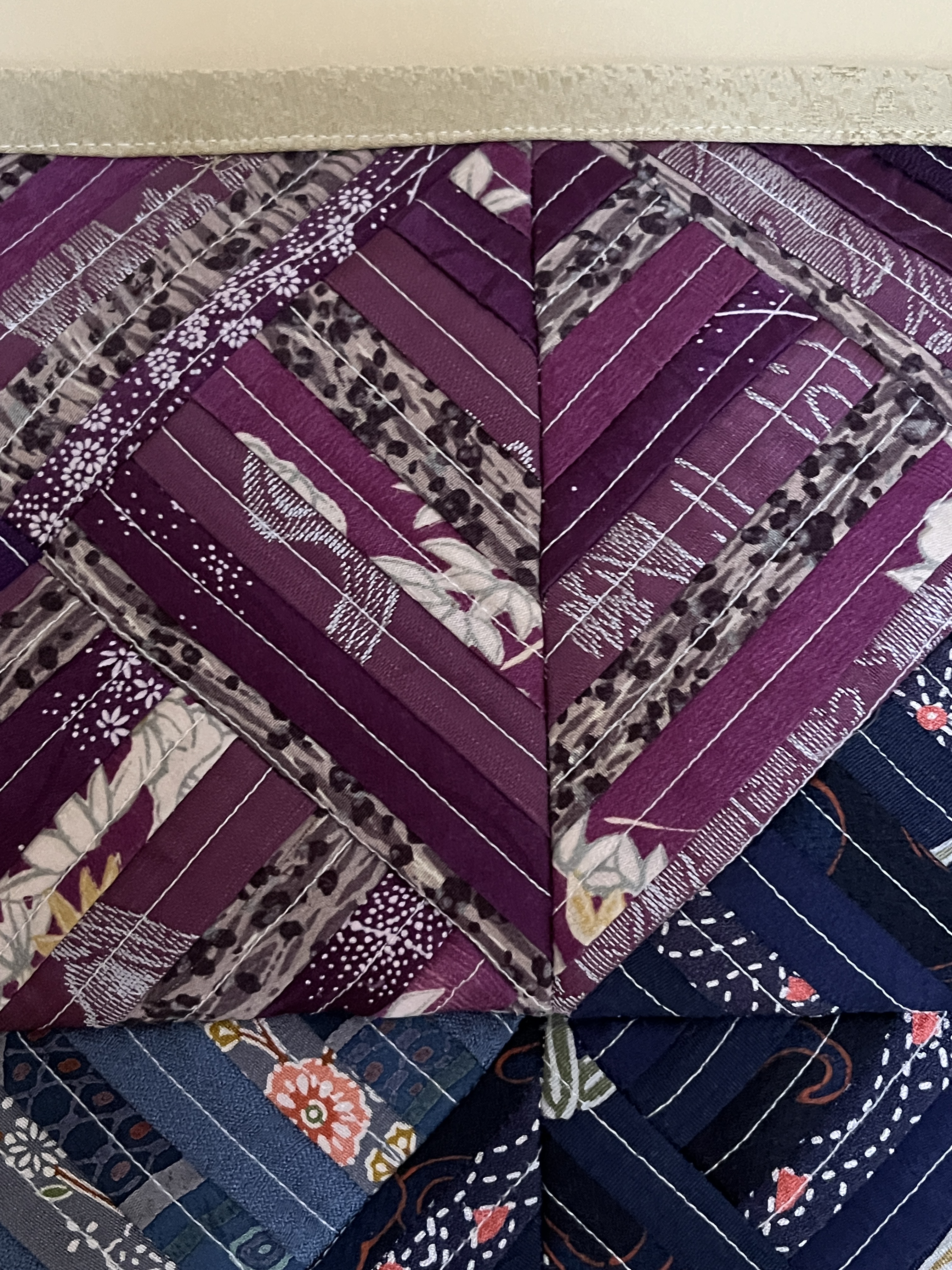 The title of wall hanging is ‘Poppy field in a sunset’. My next wall hanging project will be made from a black tomesode kimono with gold cranes. But I have to finish my other UFOs first!